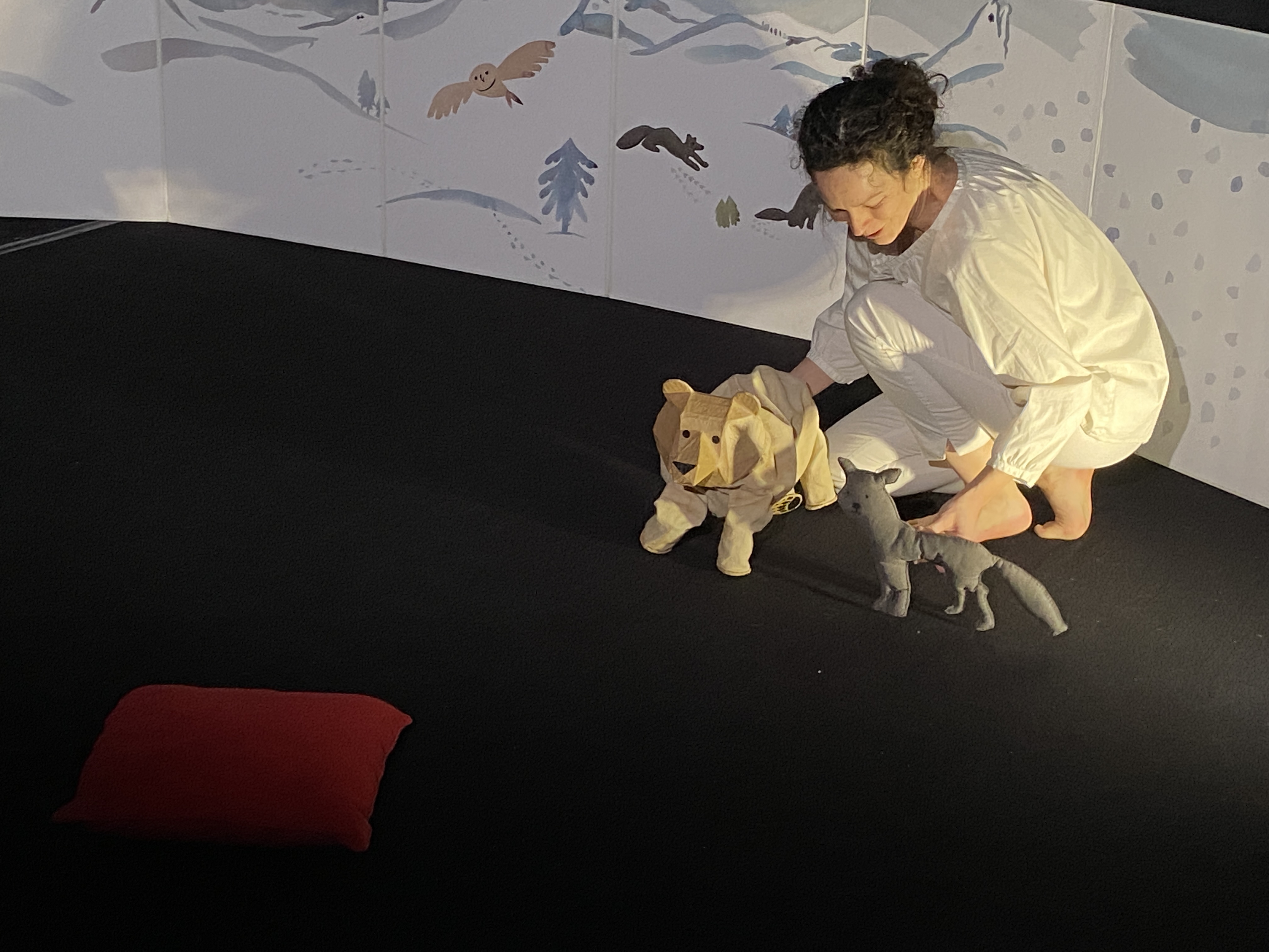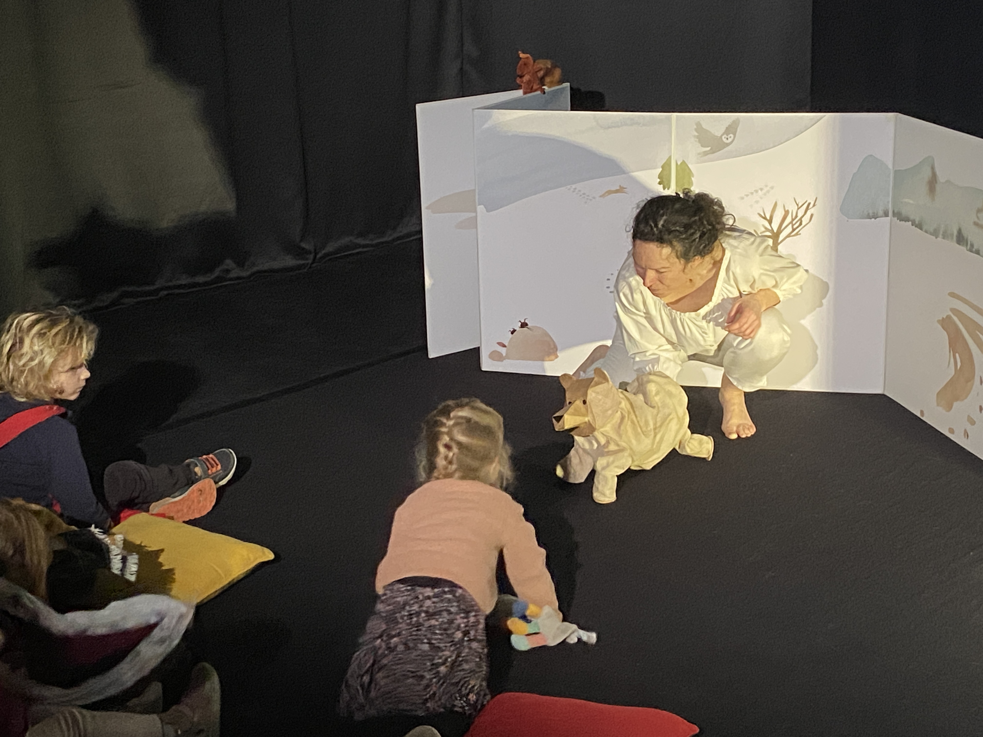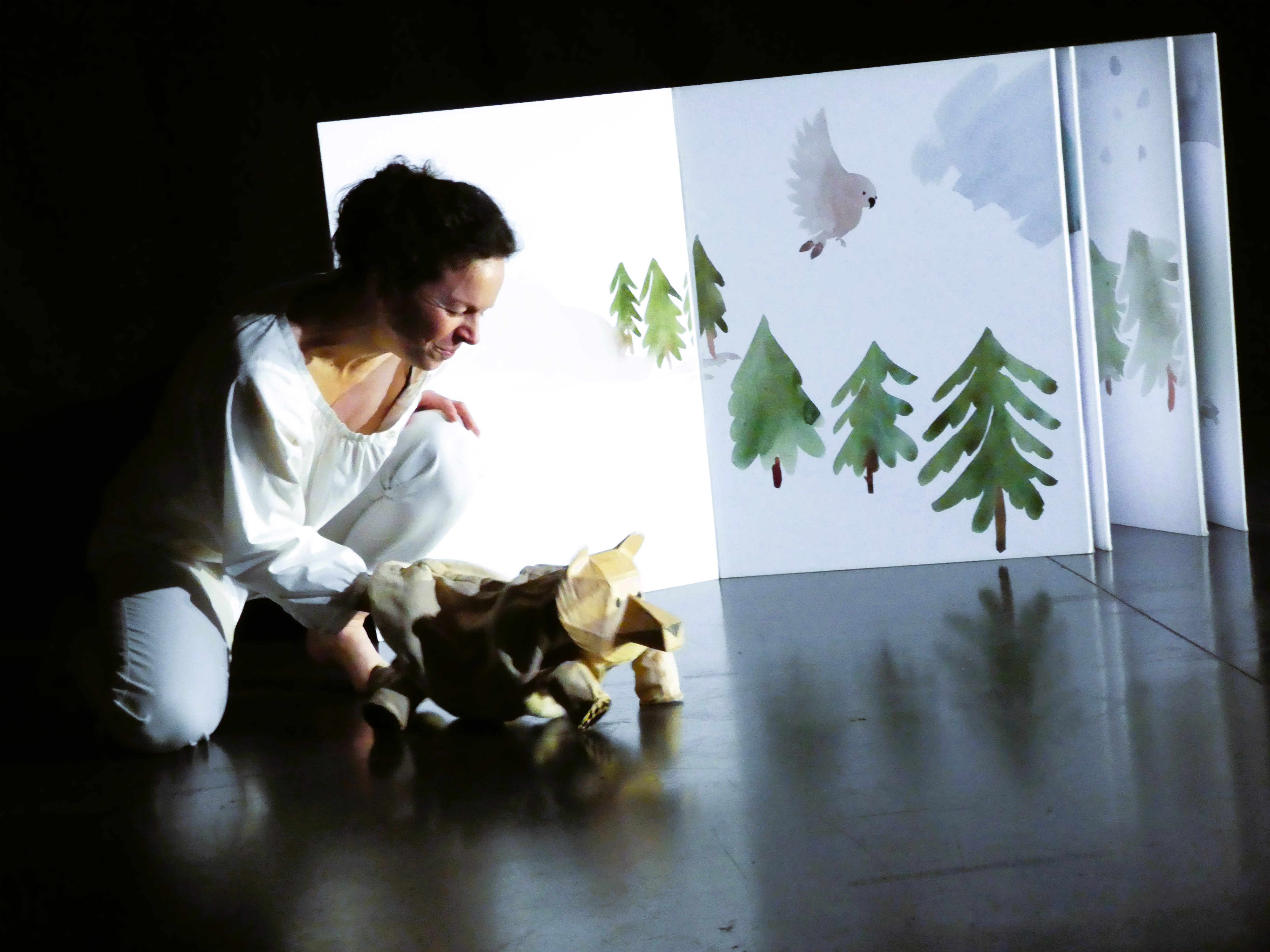 Puis pour marquer les rencontres. Quelques formes suggestives dessinées passent de la 2D à la 3D, du livre sortent les personnages animaliers, les noisettes glanées par l’écureuil, la cime des sapins, les sons de la nature, un nuage qui file.