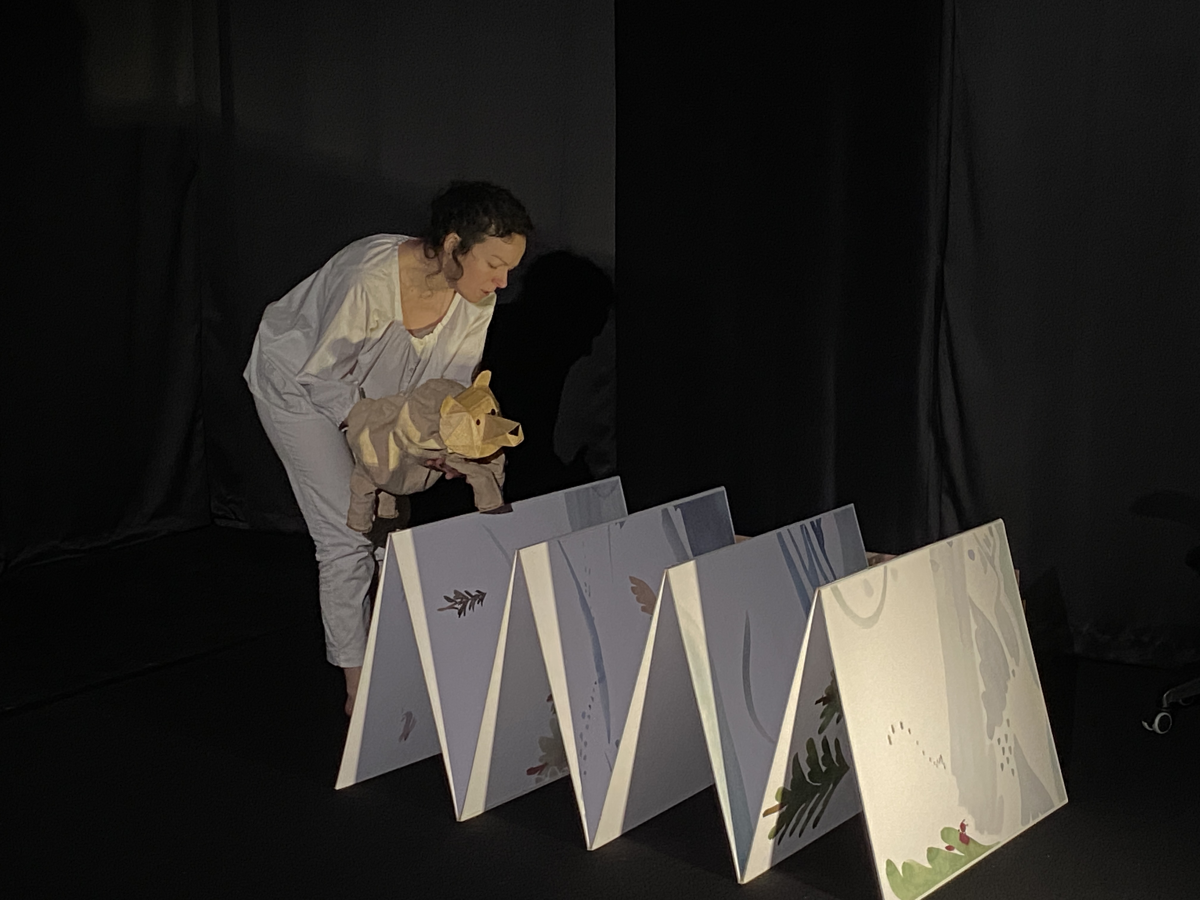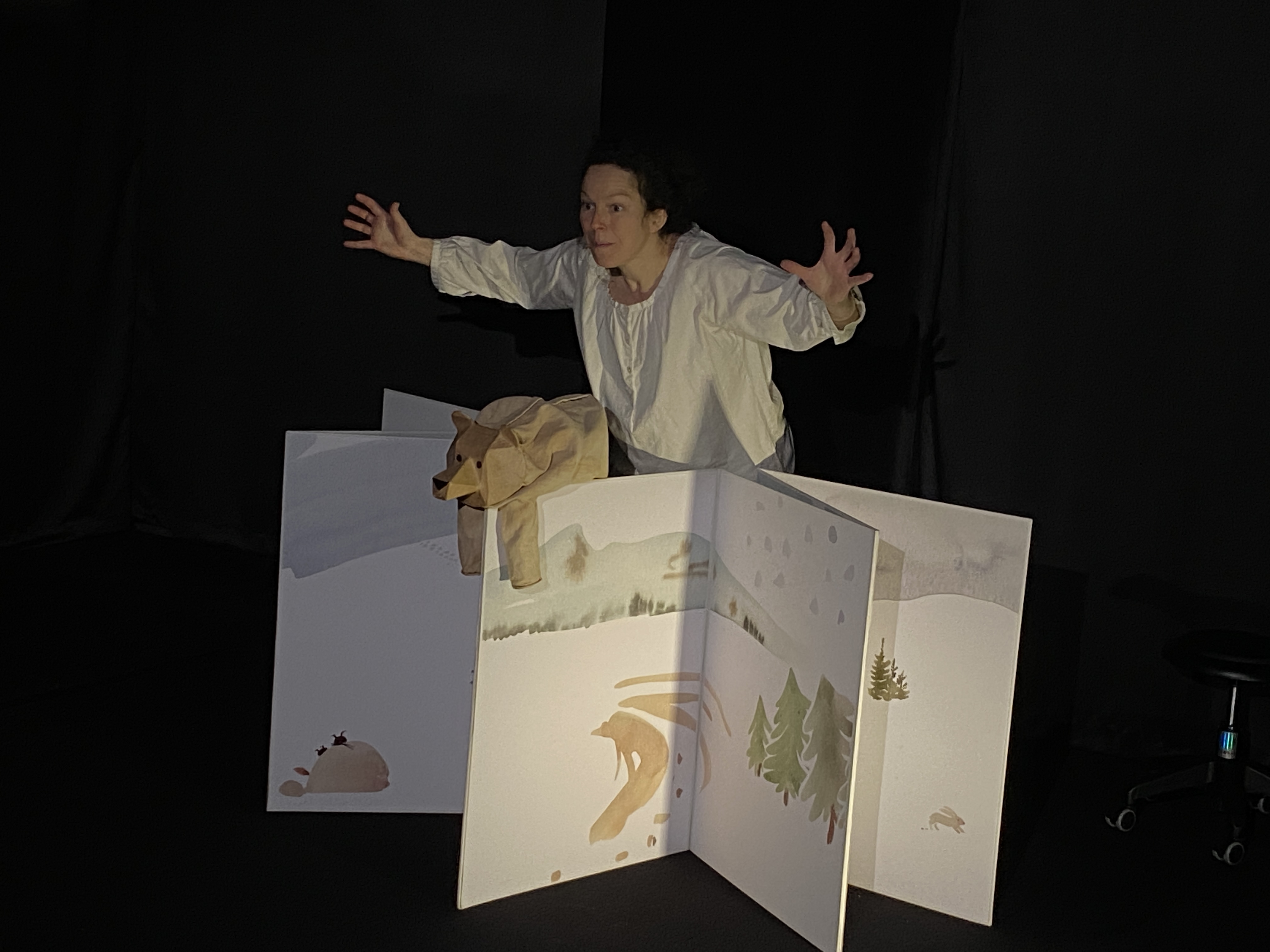 Sur scène, à l’image d’un livre ouvert apparaît le « décordéon » géant (80 x 60cm quand il est fermé). Ses pages se déploient pour raconter l’histoire de l’ours. Entre instants chantés et mots-mouvements mêlés, l’ours marionnette évolue à mesure que sur le décor apparaissent les images paysages. Le « décordéon » dessine l’espace et le transforme :